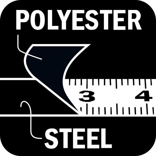 Poliester i čelik — označava da je traka izrađena od kombinacije poliesterskih i čeličnih materijala.